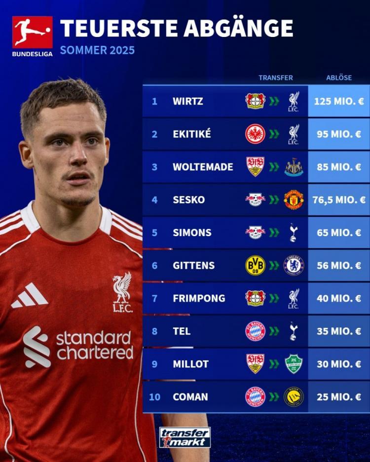 直播吧9月4日讯 德甲夏窗已经截止,《转会市场》也统计了德甲今夏的最贵卖人榜,维尔茨断崖领跑。